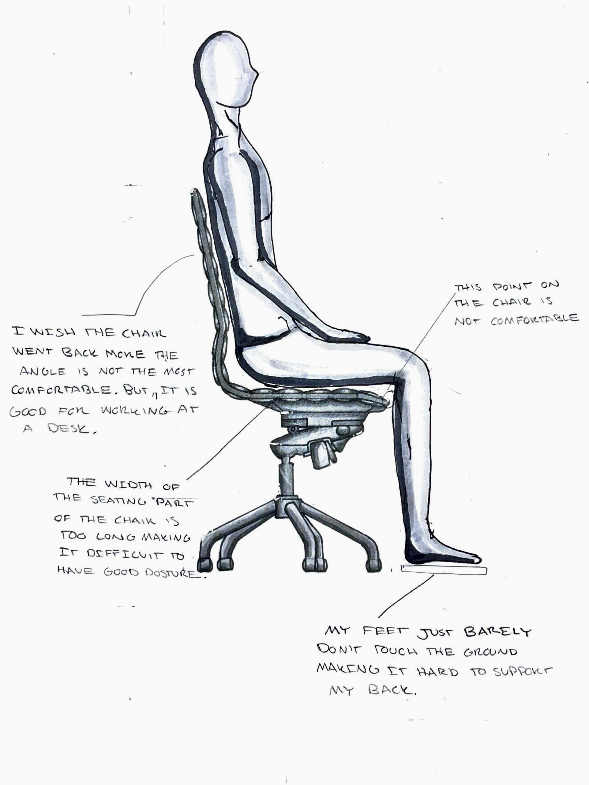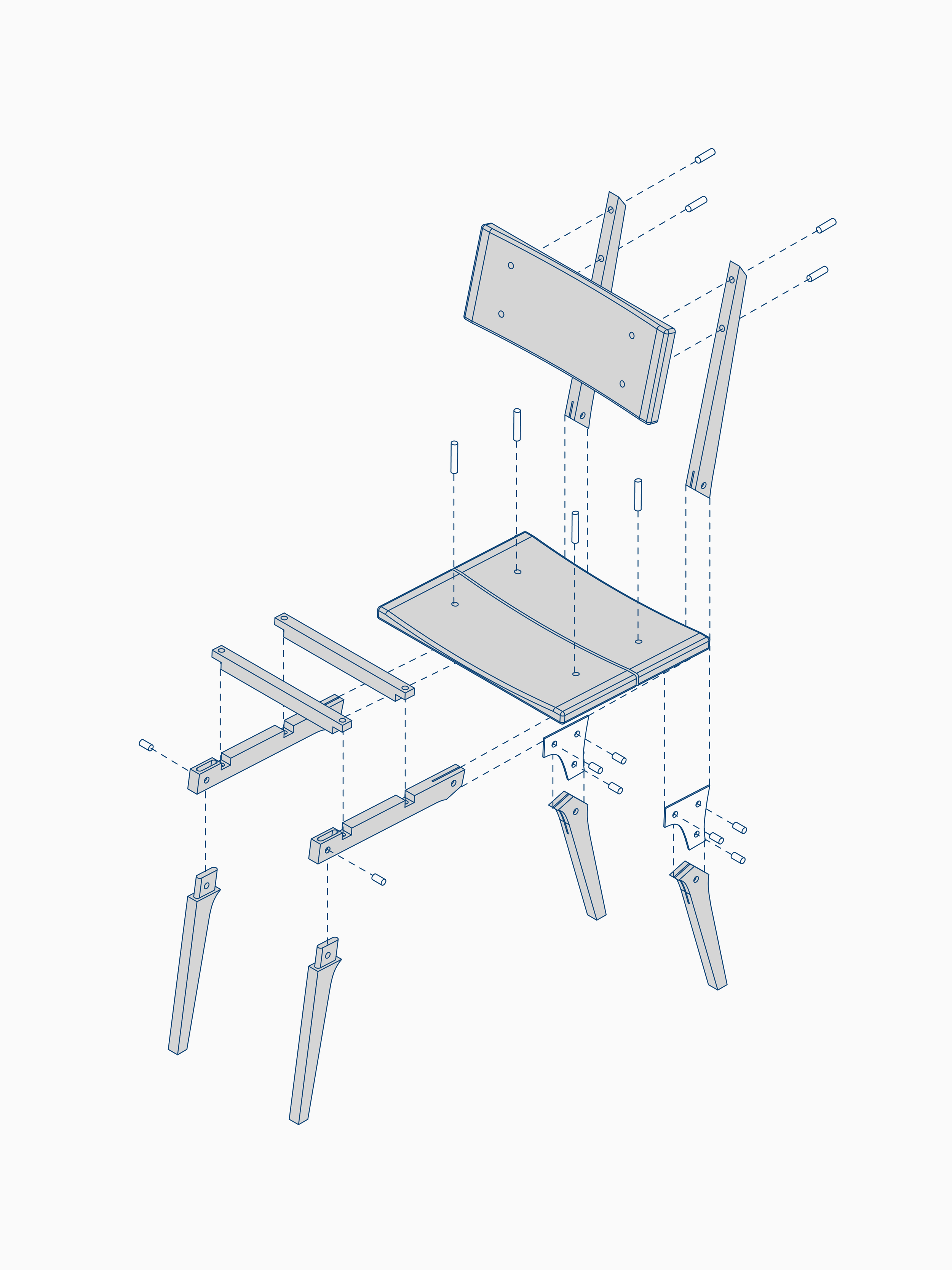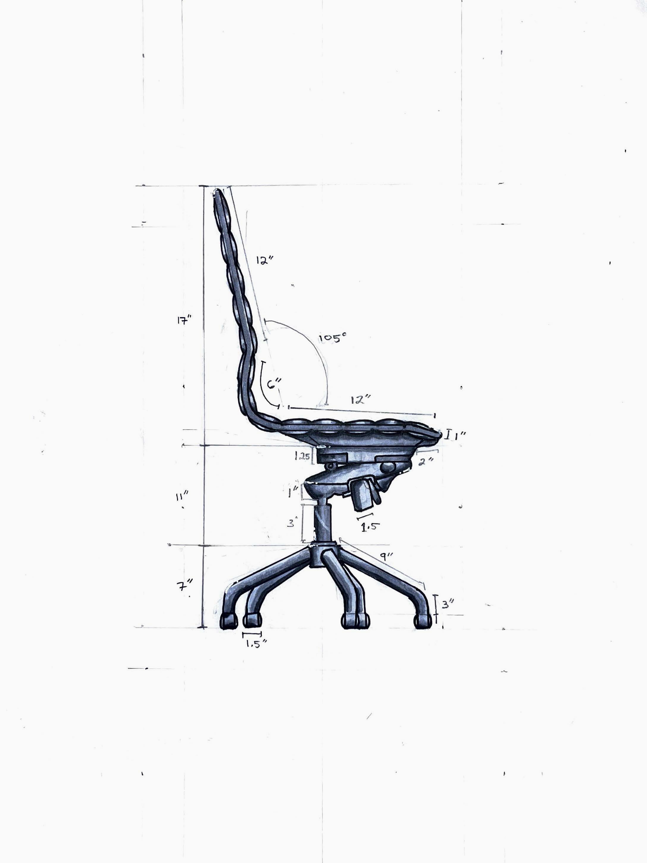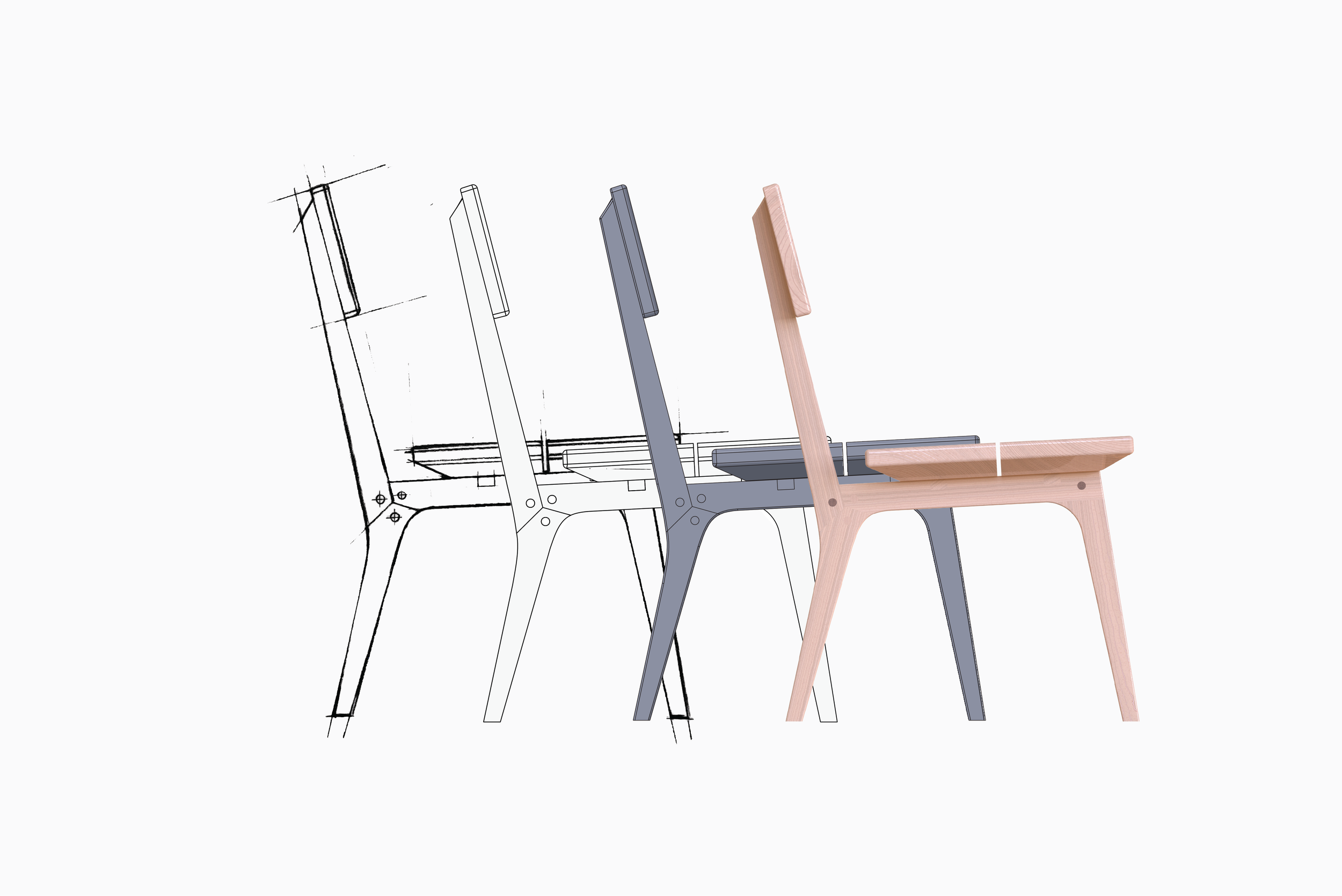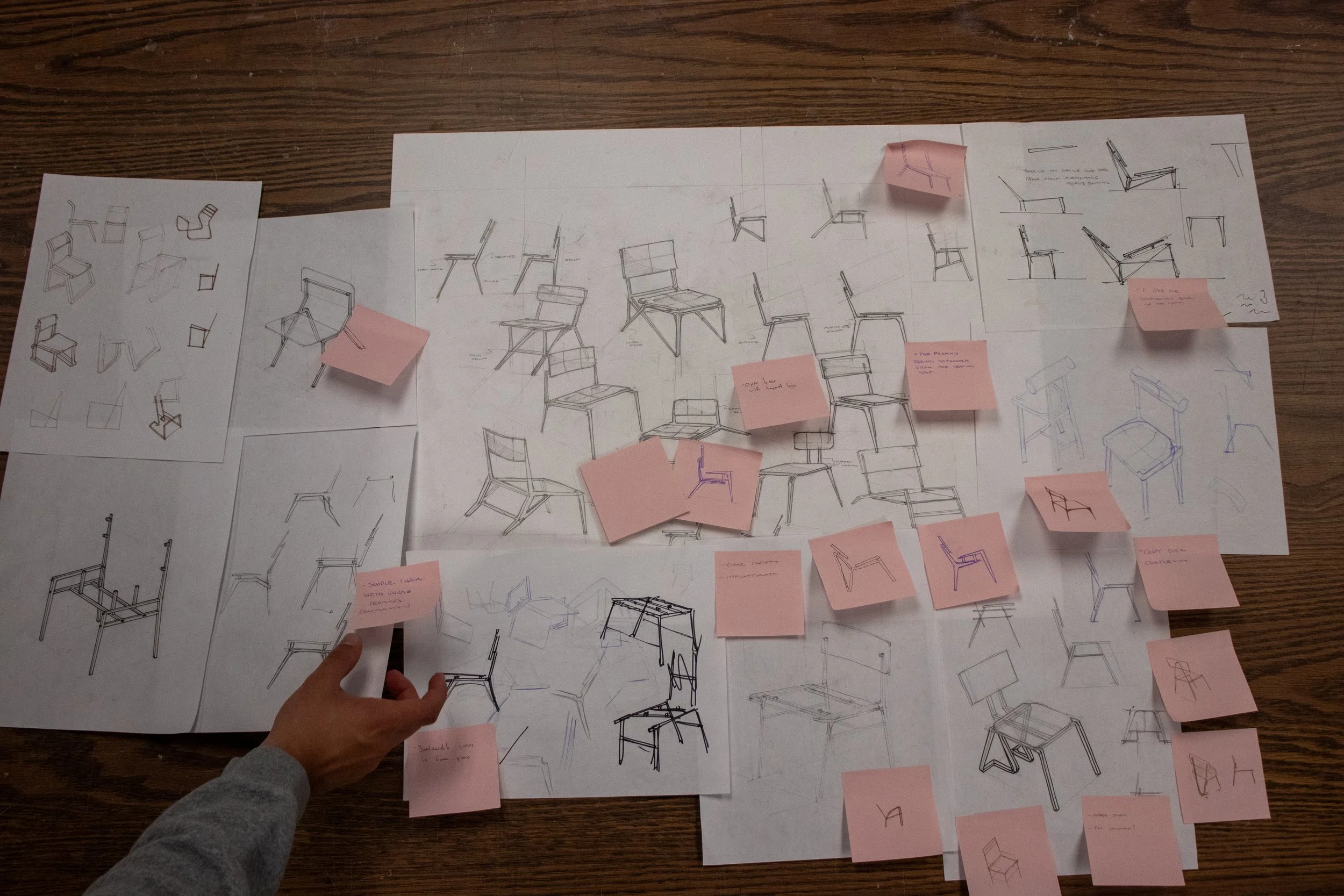 The project began with studying chair ergonomics through measurements, analysis, and quick test forms to understand posture, comfort, and structural load paths. Ideation was driven by sketching that balanced minimal form with real construction logic. These ideas were tested through 3D-printed models and physical prototypes to evaluate proportion, stability, and comfort.